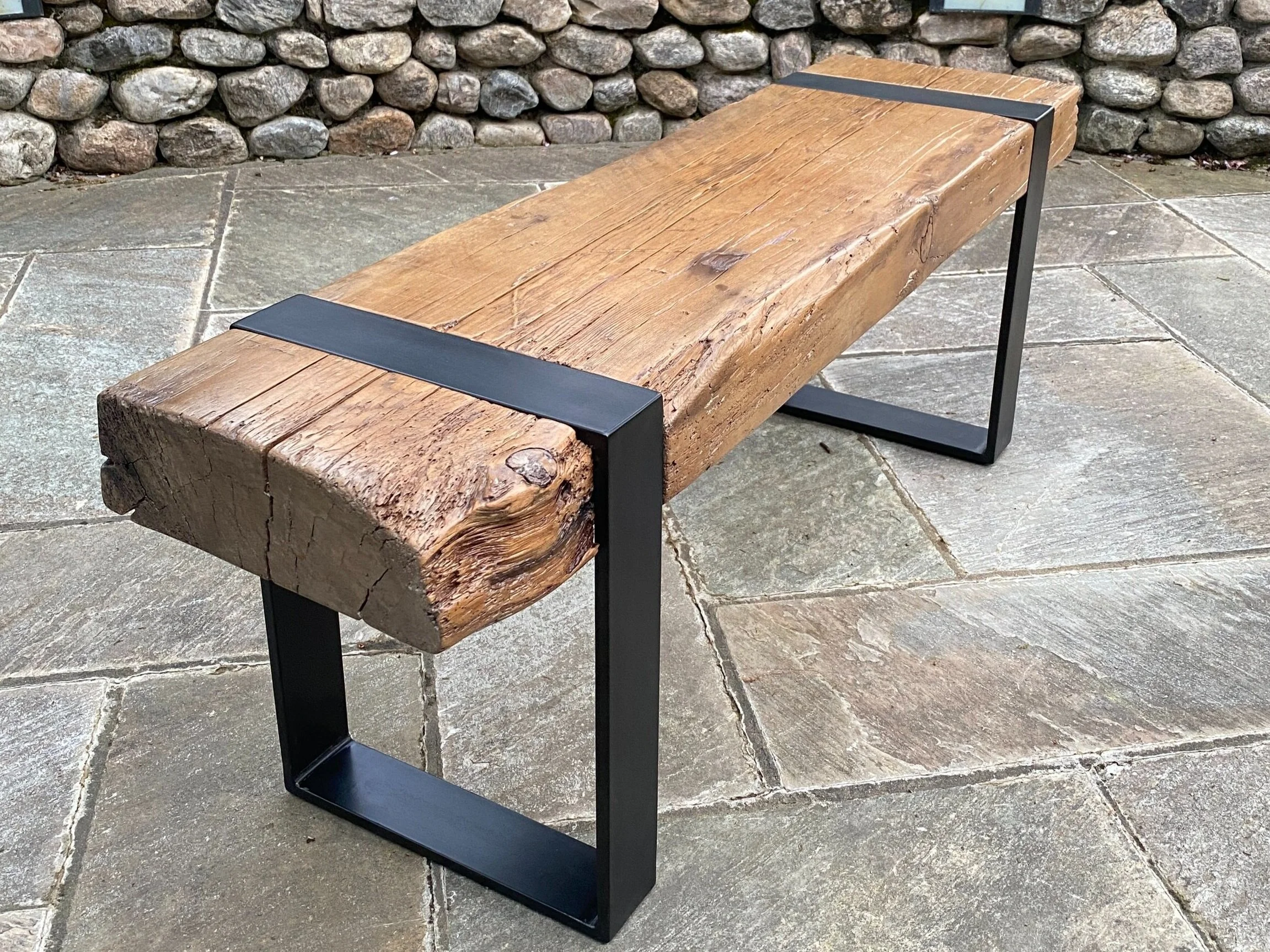 Bench made from a reclaimed beam from New York City. This bench features steel banding that is inlayed flush into the top and sides of the beam. The 1/2 inch thick steel banding acting as legs have been given a hand rubbed black patina.