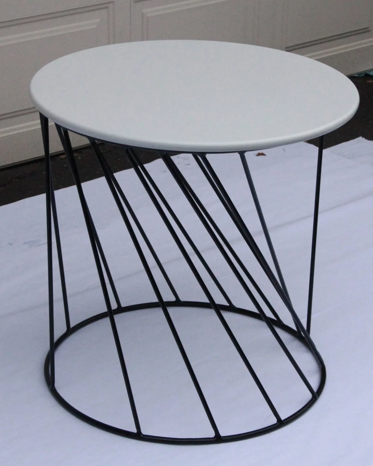 White lacquer round top table. Most unique base from my first round base series. The base is fabricated from steel round bar with a compounding slant from one upright to the next and then mirrored. At a glance this table base seems rather haphazard however looking intimately at the piece its interesting geometry is revealed.